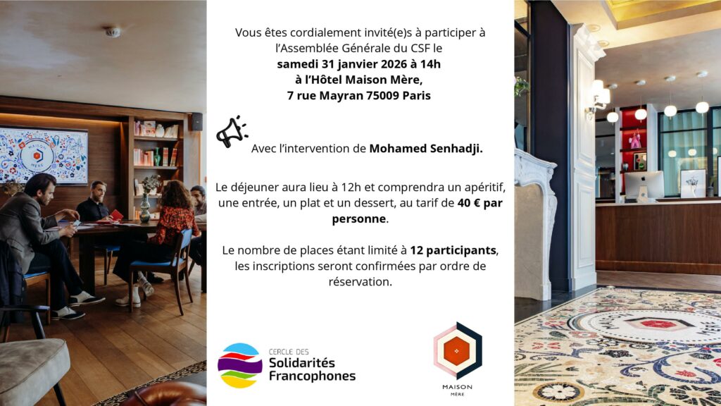 Si vous le voulez, vous pouvez participer au déjeuner sur place (apéro, entrée, plat, dessert, eau, vin et café) à partir de 12h00 en vous inscrivant via ce lien: https://www.helloasso.com/associations/cercle-des-solidarités-francophones/evenements/dejeuner-et-ag-du-csf-a-paris